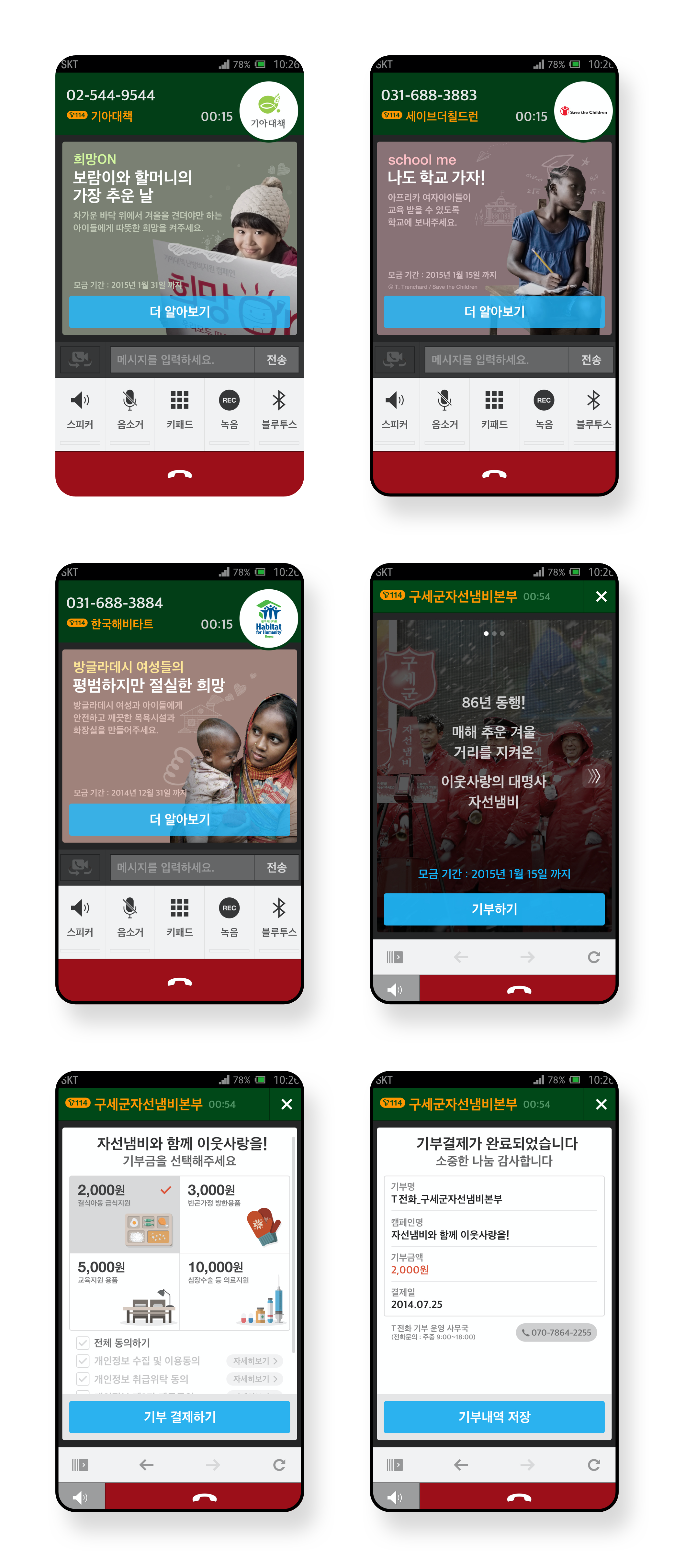 T전화의 보이는 통화 기능과 관련하여 연말 시즌에 맞춰 기부를 주제로 ‘보이는 통화 기부’로 진행된 프로젝트입니다. 통화 중 자연스럽게 사용자의 관심을 유도하고 캠페인 사연을 확인 후 기부까지 이어질 수 있도록 하였습니다.