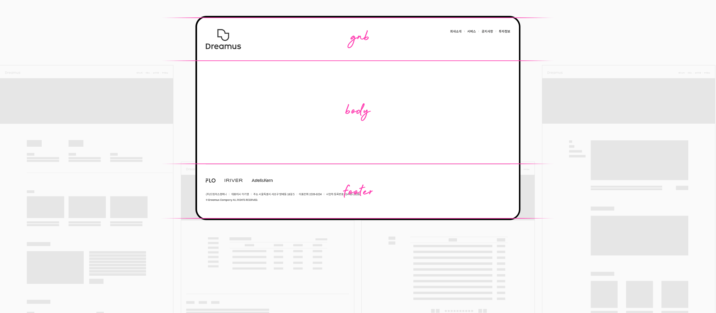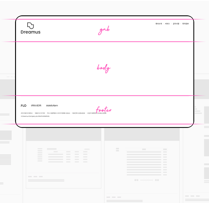 고정형 GNB로 페이지 navigating, body, footer 크게 3단계의 구조로 제작되었습니다.